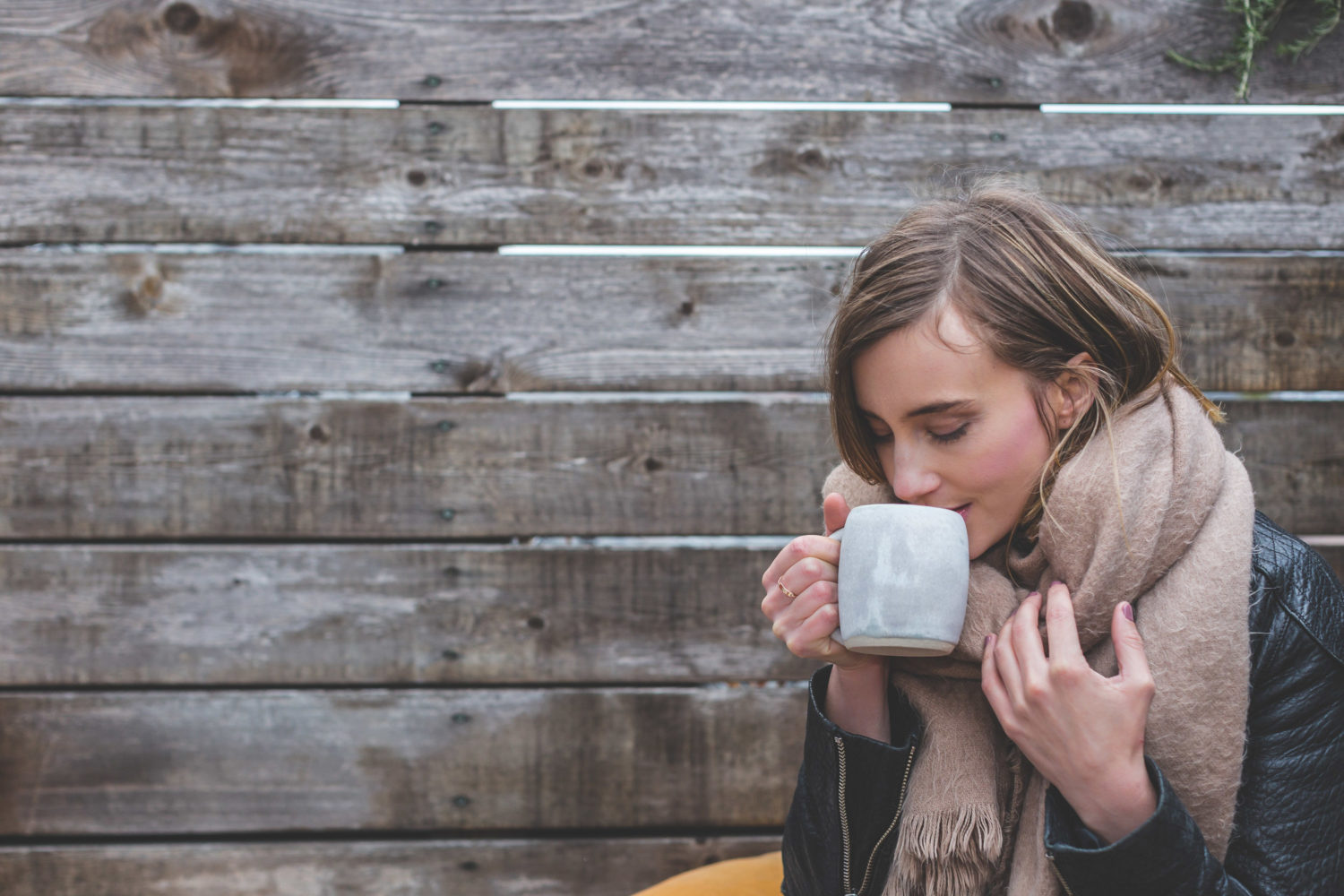 Blonde woman in a blanket scarf and jacket sipping coffee out of a mug sitting next to a wooden wall